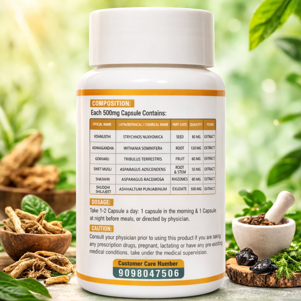 | Formulation & Ingredients | Made with powerful Ayurvedic herbs such as Ashwagandha, Shilajit, Safed Musli, and other natural energy-boosting ingredients. |
